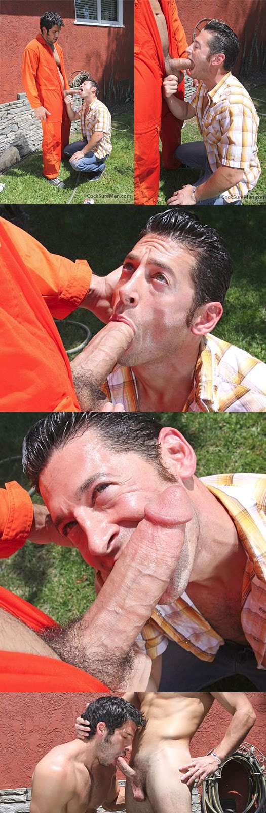 Leo Giamani knows that while he’s working up a sweat in the yard, he’s being watched by his employer Ari Sylvio who’s working up a hard dick. Leo puts on a show until he’s ready to have that mammoth dick sucked, then he calls Ari over to help him out. Leo takes Ari right there in the yard, spreading him wide and fucking him hard until Ari blows a load all over himself. Ari then gets up and takes Leo’s load right in his mouth before blowing out a second load of his own.